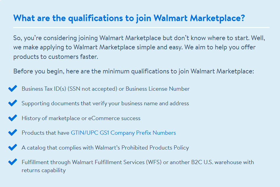 在开始在沃尔玛市场平台销售之前,你需要具备以下条件。商业税号或执照,证明你的公司名称和地址的文件,以及一些电子商务经验。