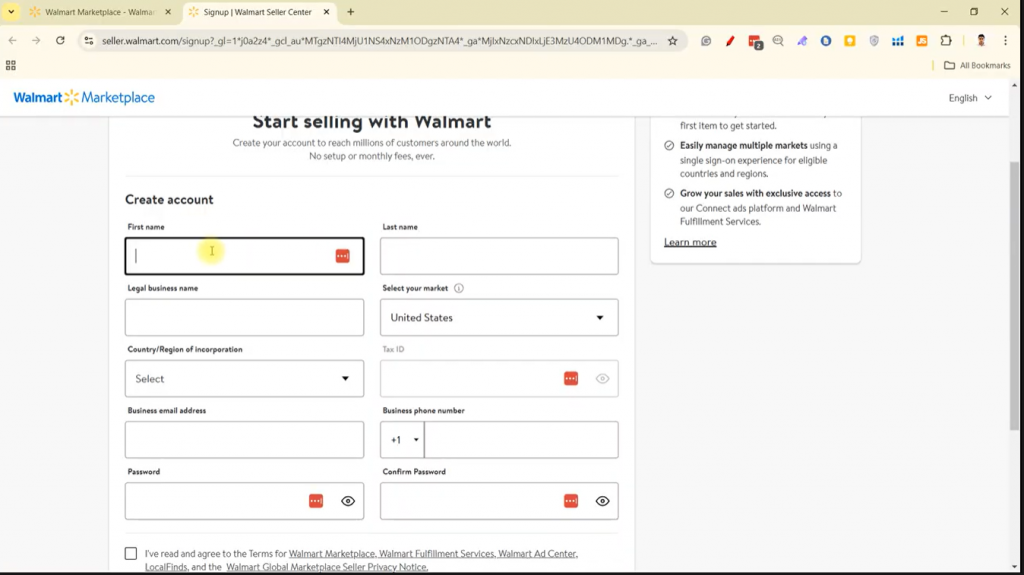 好的,你已经满足了所有要求,现在选择了产品,该怎么办?你需要申请成为卖家。要做到这一点,请前往沃尔玛市场平台。com。点击加入,现在你需要填写这些必填字段。例如,你的姓名和你的公司名称。选择你的市场。你的商业电子邮件。电话号码,最后设置一个强密码。现在,完成所有步骤后,点击创建账户。