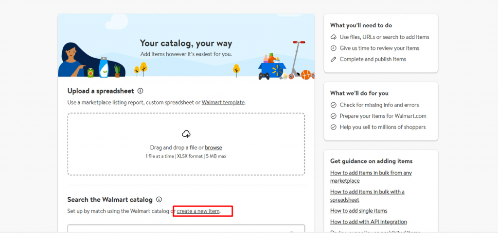 在这里,你会看到两个选项,第一个选项是通过提供的产品清单文件添加商品,第二个选项是使用沃尔玛目录。我们现在先选择第二个选项。点击创建新商品。现在我们开始添加此商品列表所需的信息。
