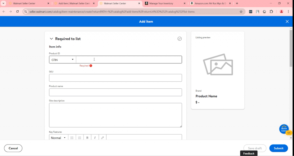 第一个信息是产品ID。你可以选择GTIN,UPC或其他信息。哪个方便就用哪个。然后输入SKU和商品名称。确保你的商品标题关键词丰富,并遵循沃尔玛的标题指南。接下来,添加网站描述和关键功能。