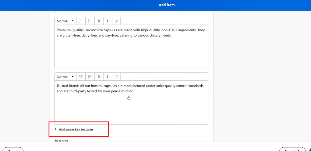 可以使用最多5个关键功能。确保你突出你产品的某个特定优点或功能。特点应该简洁明了,易于阅读。另外,关注客户最关心的问题,如产品用途、优点或独特卖点。