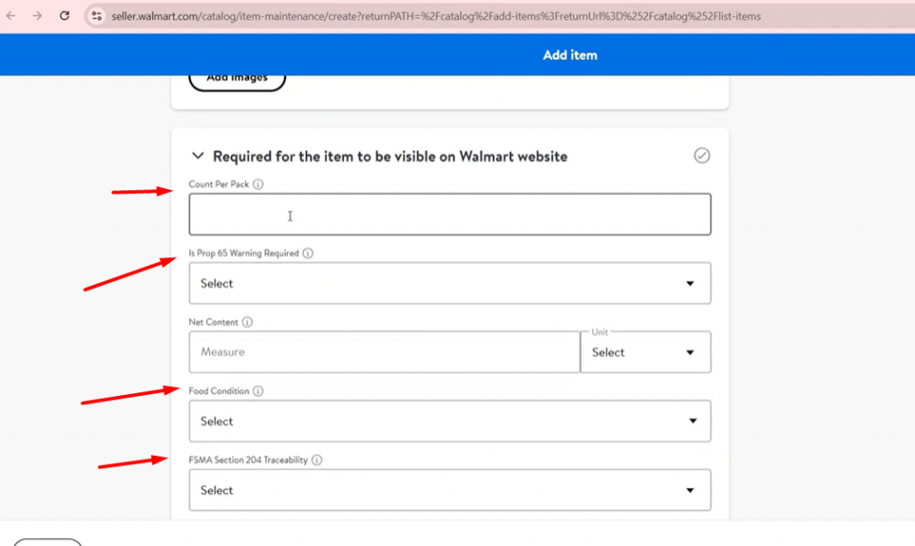 现在,在这个部分,我们需要添加将在沃尔玛网站上显示的信息。例如,每包的数量,警告,净含量,单位,食品状况等。根据你自己的情况填写这些信息。