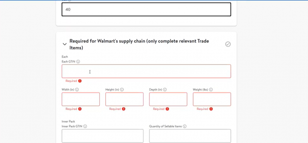 最后,我们需要添加与供应链相关的信息。再次填写我们的GTIN。填写宽度、高度、深度和重量。下面的框可以跳过。