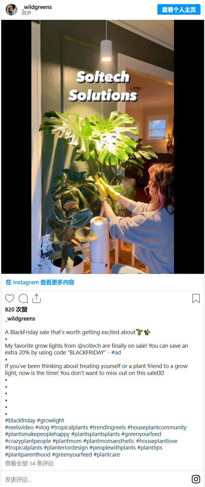这篇展示植物生长灯的帖子是 Instagram 上品牌内容的一个很好的例子。你可以清楚地看到“付费推广”的免责声明,让我们知道这是影响者与品牌之间的合作。