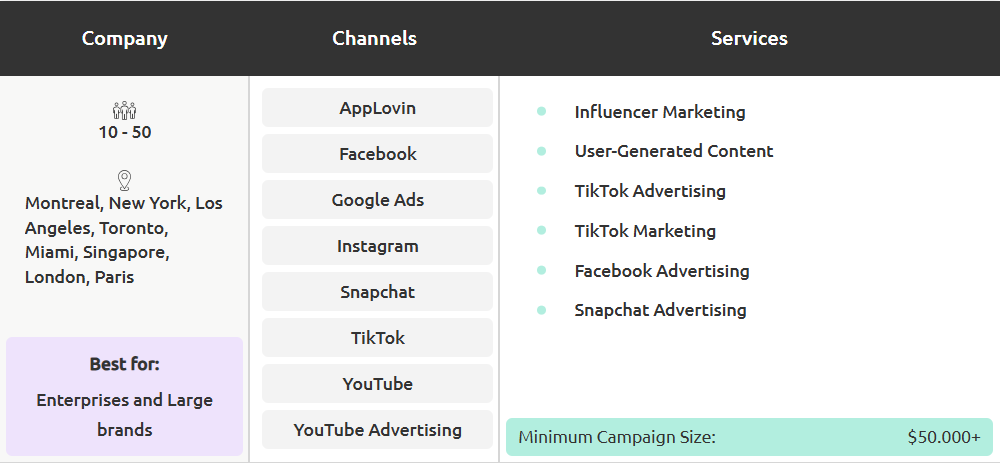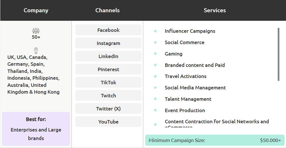 在影响力营销方面,该机构会评估活动的品牌要求,并从其拥有的10万多名影响力者中挑选最合适的人选。然后,它指导客户与影响力者之间的合作,以确保实现项目的营销目标。