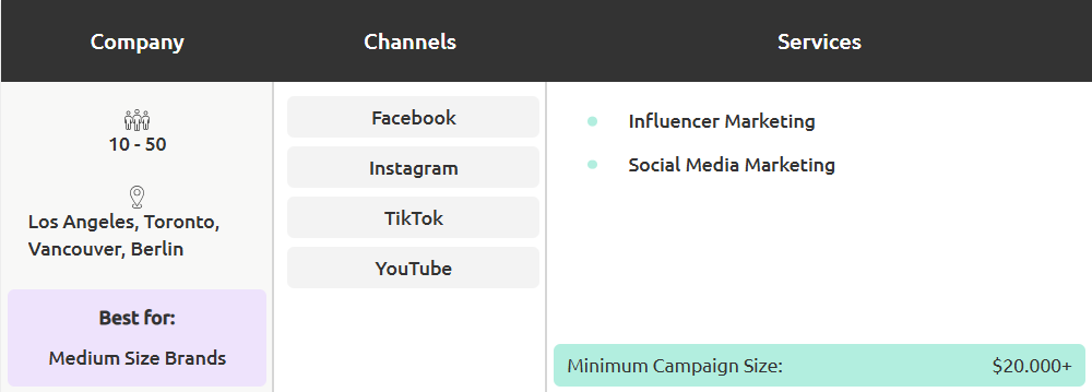 影响力猎人是一个充满活力的营销团队,他们相信与影响力者合作是建立人们喜爱品牌的最佳方式。虽然总部设在洛杉矶,但该机构还拥有一系列加拿大客户。