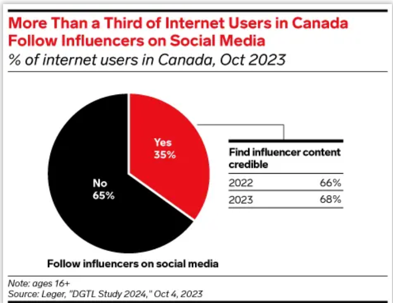 全球范围内,影响者不断获得忠实的追随者。加拿大尤其如此,年轻创作者与高度参与的社交媒体用户建立了更深的联系。随着消费者在社交平台上花费的时间增加,品牌可以通过与已有追随者基础的影响者合作,潜在地扩大其客户群。
