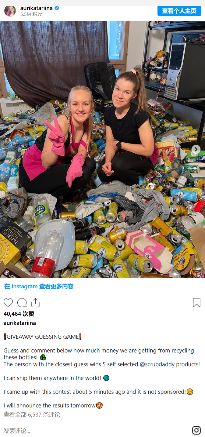 以Scrub Daddy为例。他们与清洁网红Auri Katarina合作,抽奖他们的产品。人们必须留下评论回答一个问题,这作为他们参与抽奖的资格。该帖子获得了超过41,000个赞,显示了网红主导抽奖活动的效率。