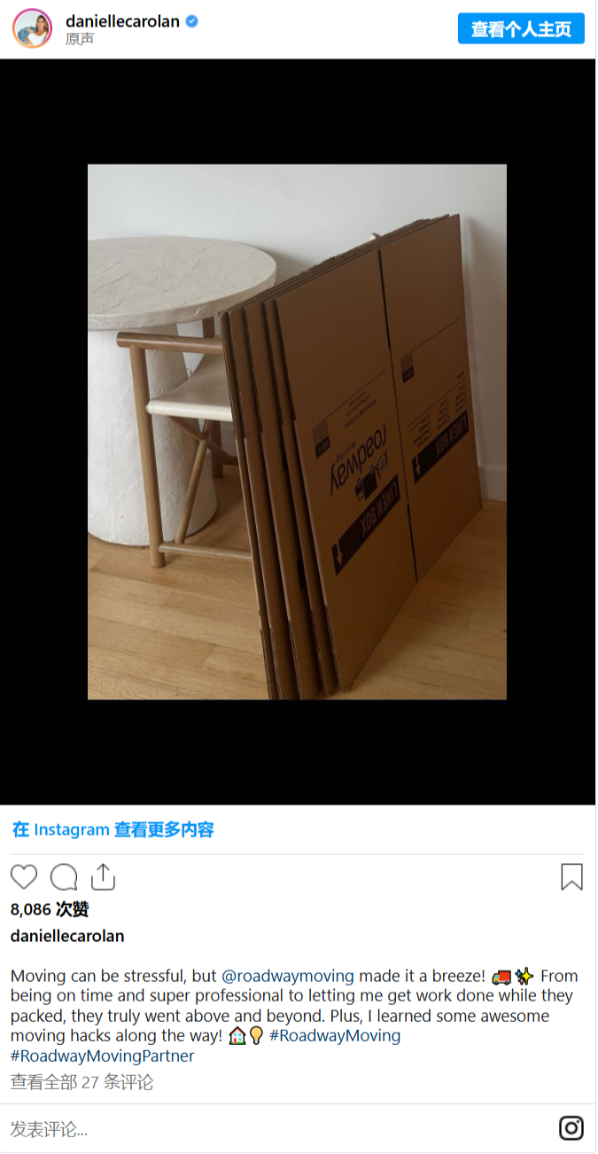 例如,搬家公司Roadway Moving与Danielle Carollan合作,帮助她搬进新公寓。由于她在TikTok和Instagram上都有大量的粉丝,品牌让她在两个平台上分享她的搬家经历,结果总覆盖人数超过50,000人。