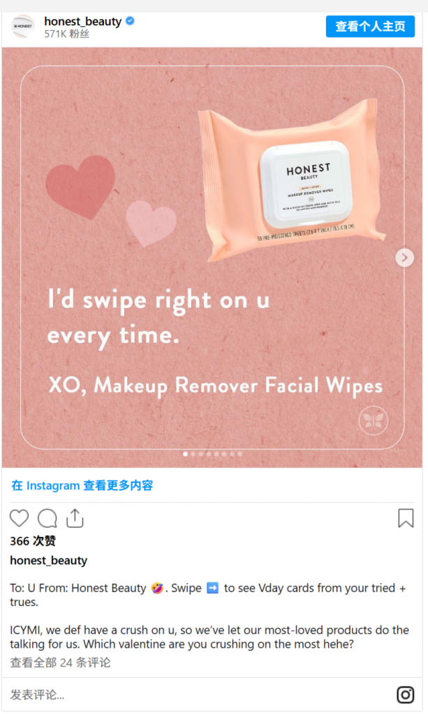 Honest Beauty创建了一个有趣的旋转木马帖子,展示了该品牌最受欢迎的产品的情人节卡片。然后,他们请追随者评论他们最喜欢哪张情人节卡片。
