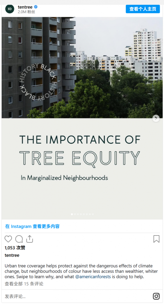 例如,在下面的帖子中,tentree分享了一个关于树木公平性的信息图表的旋转木马帖子。他们在标题下方询问人们滑动以了解该主题。