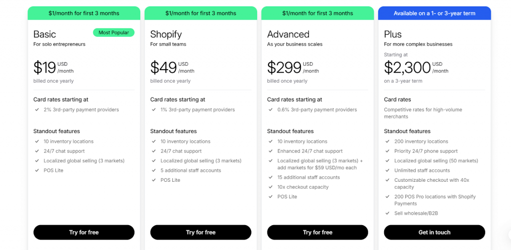 开设Shopify店铺很简单。你可以从免费试用开始,第一个月只需1美元!一个月后,你需要选择一个最适合你业务的计划。Shopify提供四种类型的计划,你可以随着业务的发展在它们之间切换。