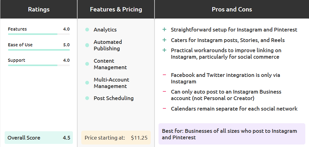 Later(官方名称:Latergramme)帮助简化你的社交媒体策略,以便你可以为更多销售和成功做好准备。功能包括视觉安排、媒体管理、营销和分析。你可以直接从电脑或移动设备上传照片,通过提前规划和安排Instagram帖子来节省时间。应用还允许你从一台设备管理多个Instagram账户,并在发布前预览你的Instagram动态。Later是Instagram合作伙伴,使用Instagram Graph API进行发布,因此你可以放心你的账户总是安全的。